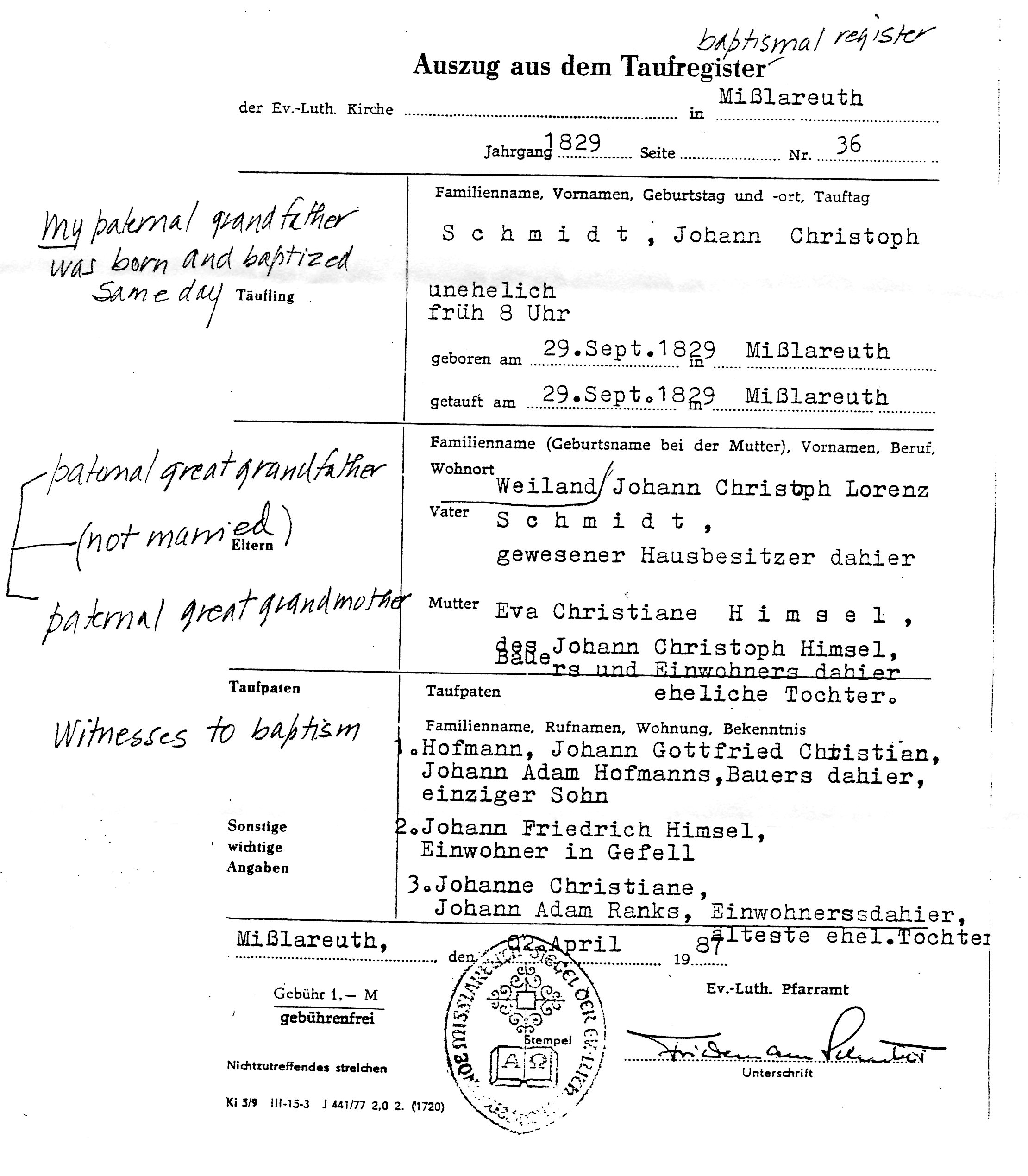 other | 1. Johann Gottfried Christian Hofmann, only son of Johann Adam Hofman, farmers in Dahi