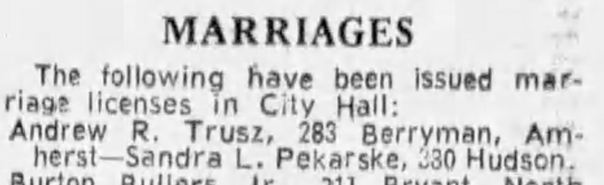 The date given was supplied by Doris Parks, and my knowlege supports the year. The location is a best guess by Doris. The parties themselves and remaining family have been non-responsive. I also made contact with a priest sharing the Trusz surname in Hamilton, but he seemed unaware of any family connection and did not admit to performing the service. The Toronto Public Library informed me that local newspapers did NOT report licenses issued, and since I have no reason to suspect that the couple had family in the area, I do not expect a newspaper report of the wedding. 2020MAY05: subsequent contact with Marsha Parks Richards tends to support this info and adds that a second ceremony was later conducted in Memphis for family and friends to attend. 2026JAN22: Found this on Ancestry today:
